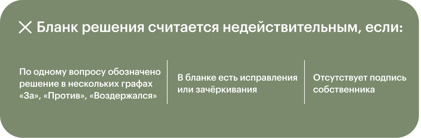 Ответ: Каждый собственник принимает только одно решение по каждому вопросу повестки Общего собрания собственников, независимо от количества и/или площади помещений в собственности